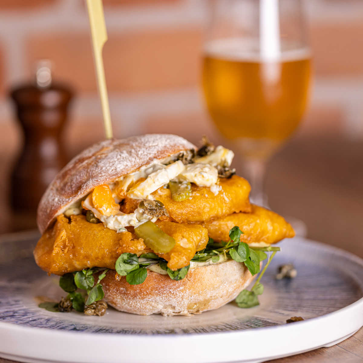 Oh Capi-tan - Fish-finger sandwich, dill mayo, chopped egg, pickles, fried capers, sourdough bun | 10.5 539 kcals