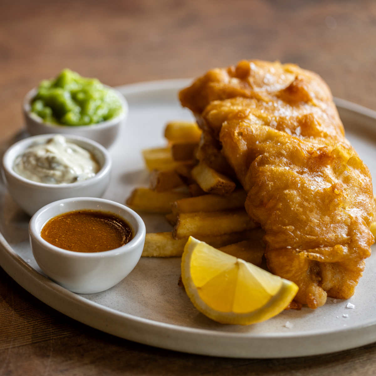 Beer-battered fish & chips, minted mushy peas, homemade tartare, curry sauce | 18 1657 kcals