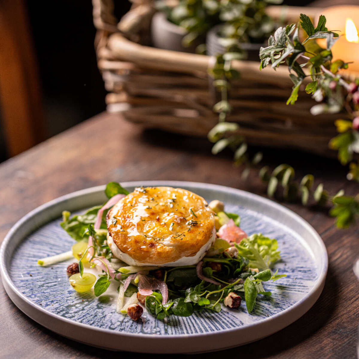 Grilled goat’s cheese, Waldorf salad, hazelnuts, thyme honey (v) | 16.5 774 kcals