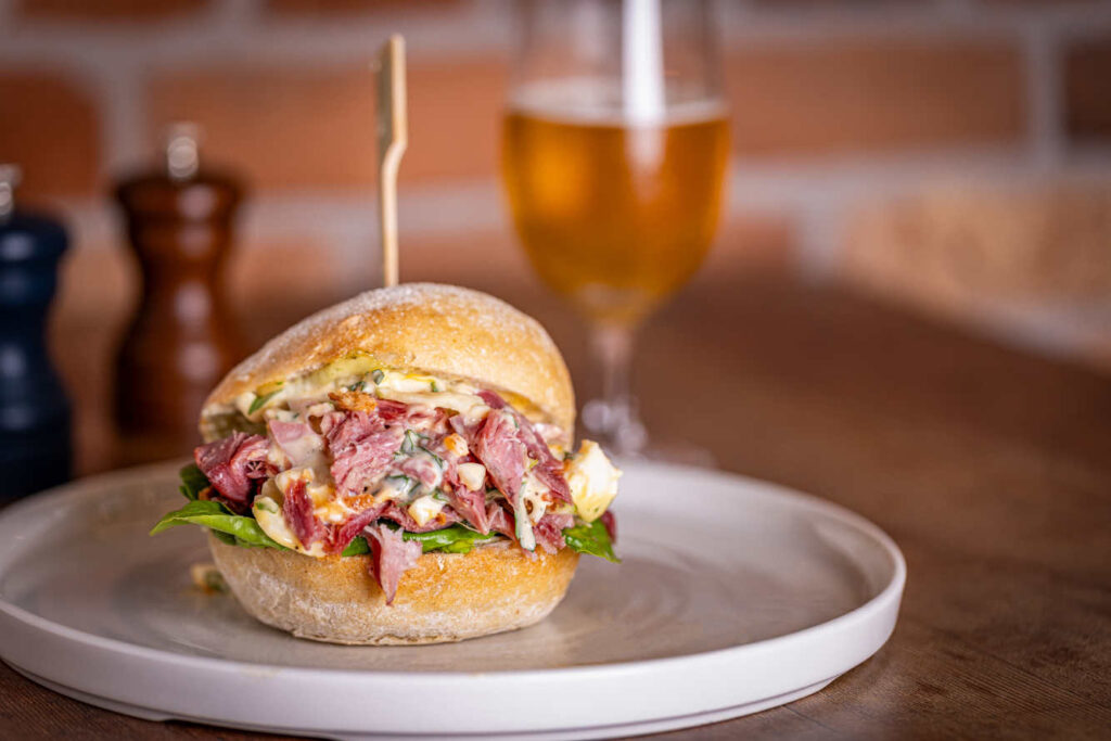 The Hogarth - Pulled ham hock, hot honey, green apple, watercress, egg mayo, sourdough bun | 11.5 405 kcals