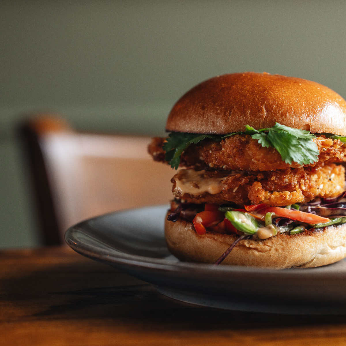 Korean chicken burger, sesame seaweed, kimchi, gochujang mayo, skin-on chips | 17 1372 kcals