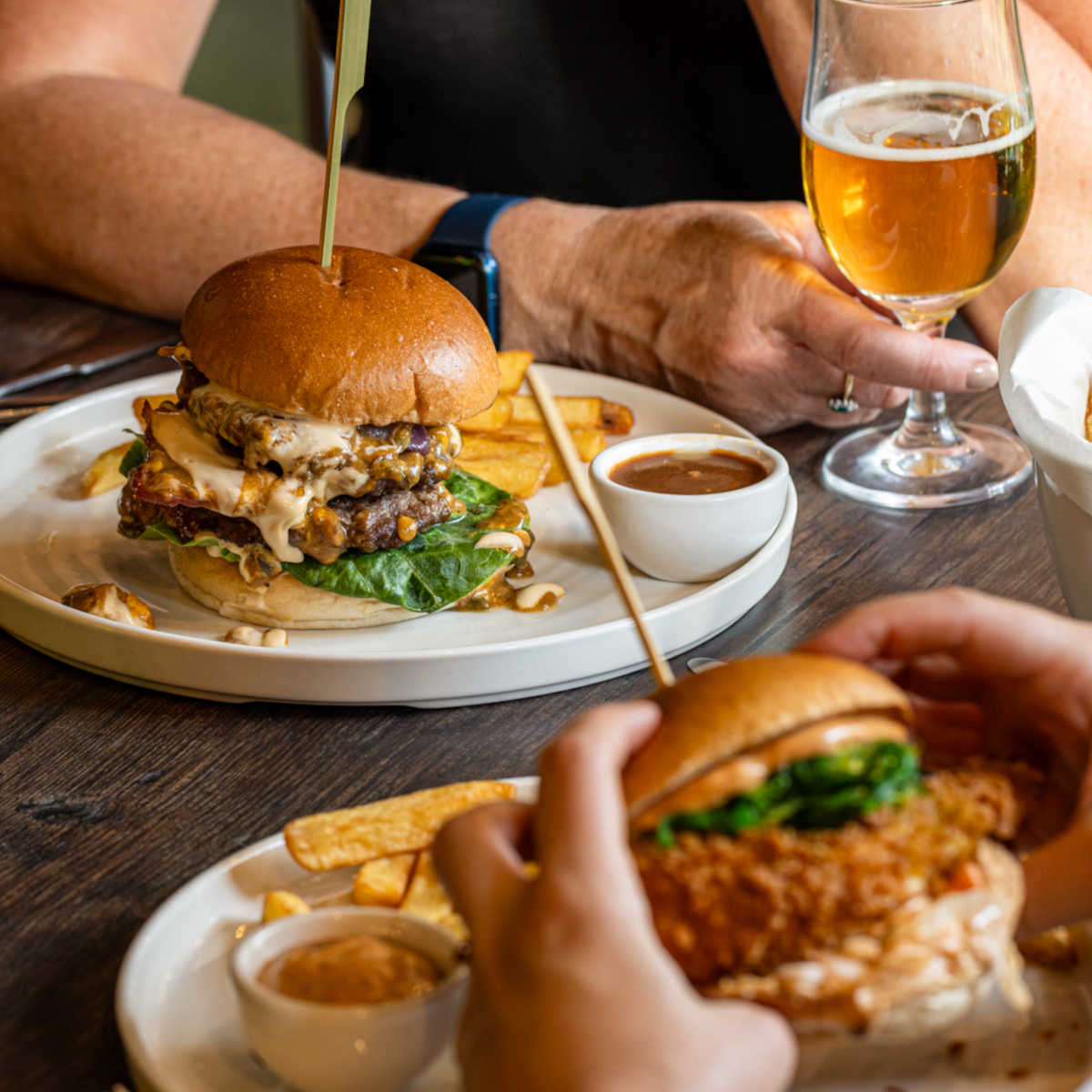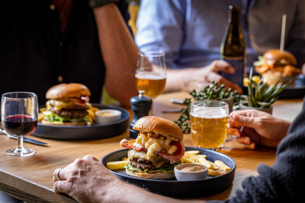 Blacksticks blue cheese, double beef burger, bacon, caramelised red onion, peppercorn mayo, skin-on chips | 18.5 1992 kcals