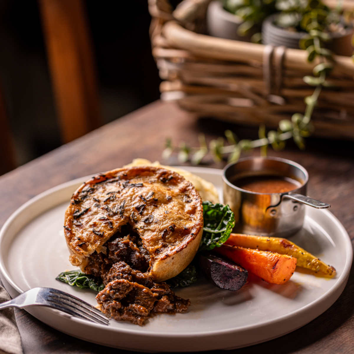 British steak & ale pie, mash, roasted roots, buttered cavolo nero | 17 1107 kcals