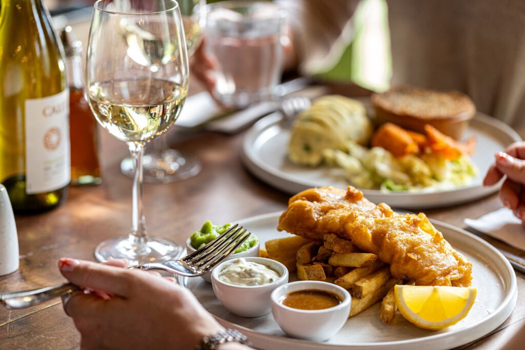 Beer-battered fish & chips, minted mushy peas, homemade tartare, curry sauce | 18 1657 kcals