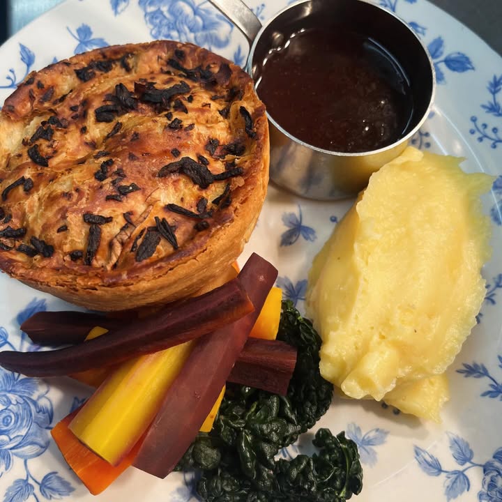 Pictured is our Steak & Ale pie served with creamy mash, rainbow carrots and a rich pot of gravy.